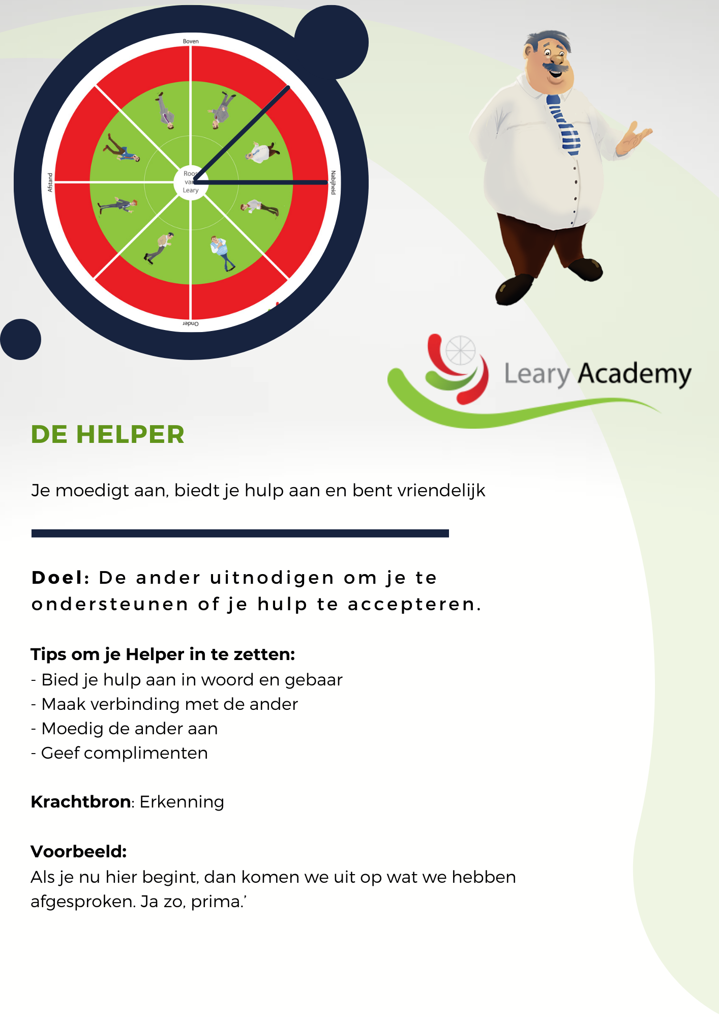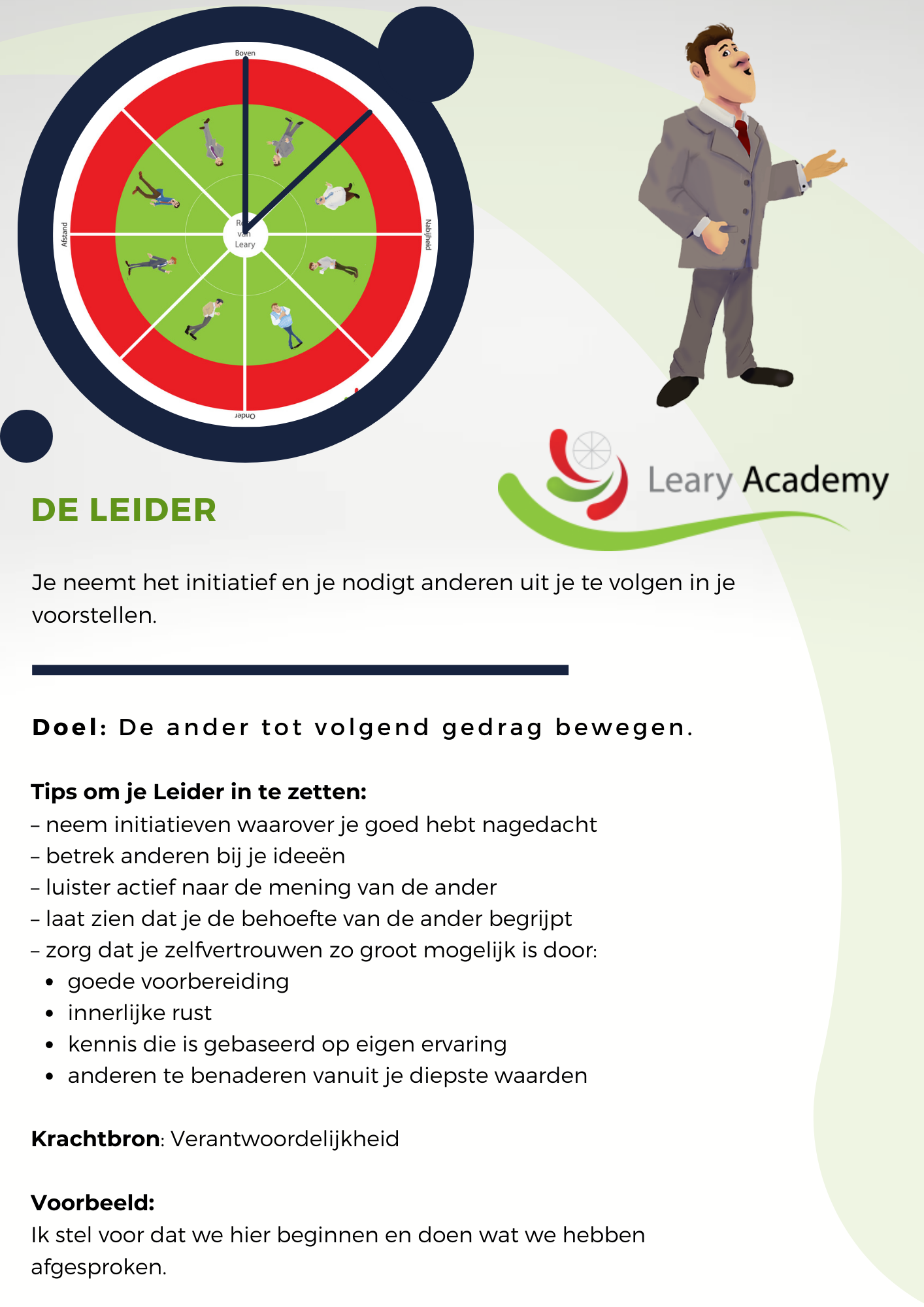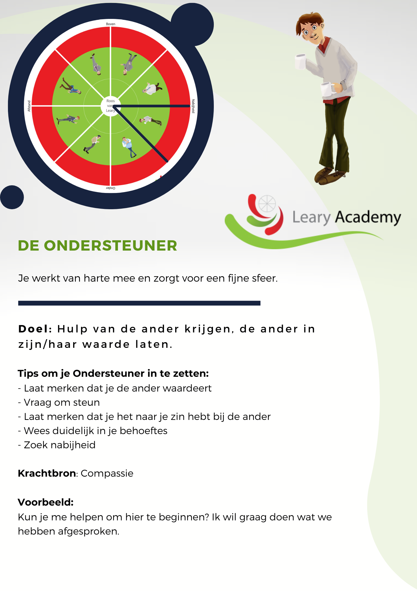 De Roos van Leary staat bekend als een van de meest gebruikte methodieken bij het leren van effectief beïnvloeden en het begrijpen van gedrag. Je hebt last van het gedrag van een ander, en jij kan zelf iets anders doen om de ander mee te laten bewegen in een richting die voor jezelf prettiger is en door de ander wordt geaccepteerd. Hoe je dat doet, kan je leren op www.roosvanleary.com